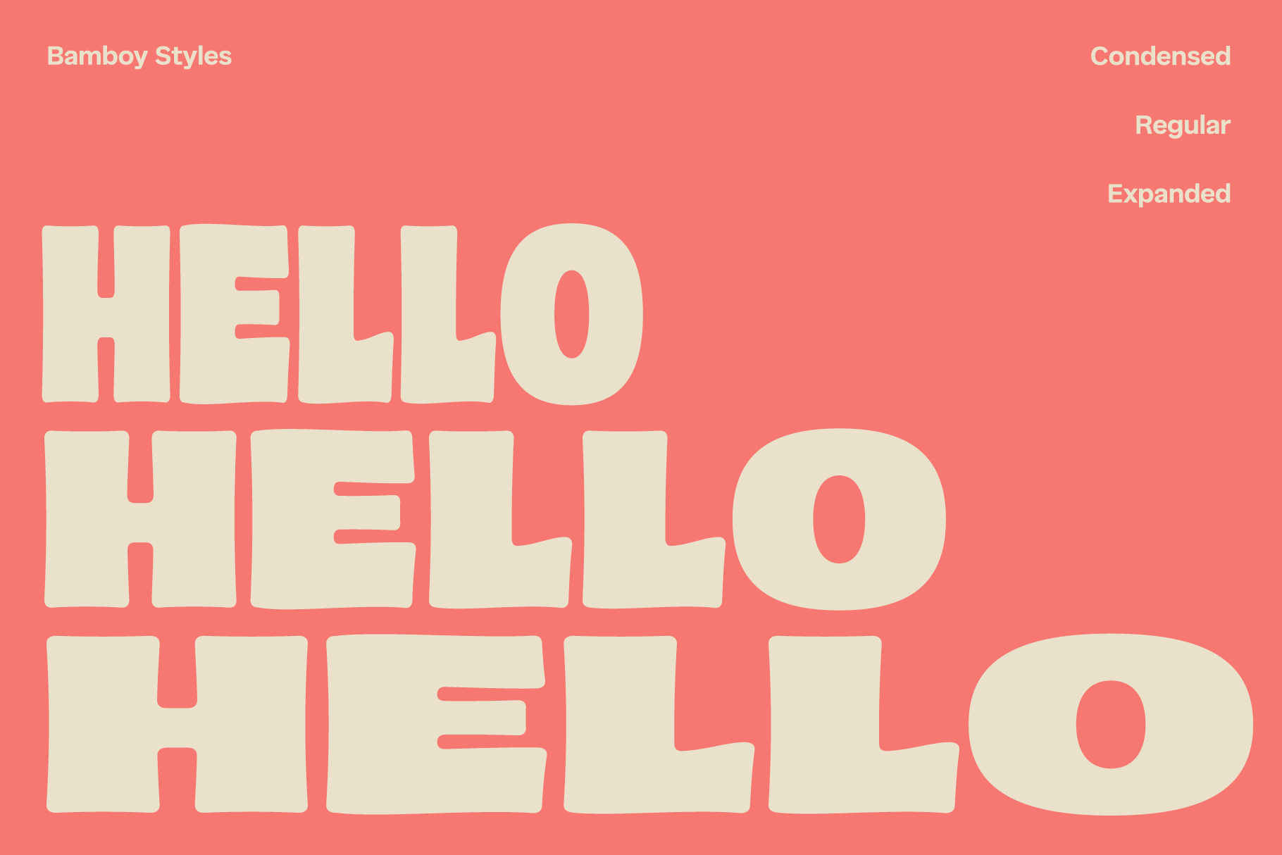 Bamboy is a soft groovy display font family characterized by its fun, retro vibe, with variable width and unique swinging terminals. Bold and eye-catching, it features cool inktraps, making it perfect for designs with a 70s or retro theme. Bamboy is ideal for branding, food packaging, product designs, and fun projects. Whether used for large displays, titles, headers, websites, or brand identities, it brings a playful yet bold touch to any creative or graphic design purpose.