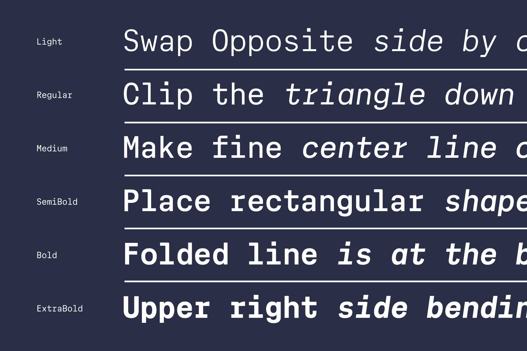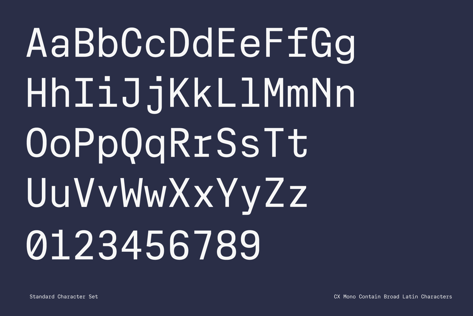Cx Mono is a modern sans-serif monospace typeface designed for clarity, balance, and contemporary aesthetics. Built with a clean modern grotesk sans serif structure, it delivers excellent readability across technical and visual contexts. Cx Mono features 12 styles ranging from Light to ExtraBold, each with matching italics, providing flexibility for hierarchy and emphasis without breaking the monospace rhythm. Ideal for coding environments, modern layouts, digital products, UI design, branding, and editorial use, Cx Mono combines functional precision with a refined modern character, making it a versatile choice for both professional and creative projects.