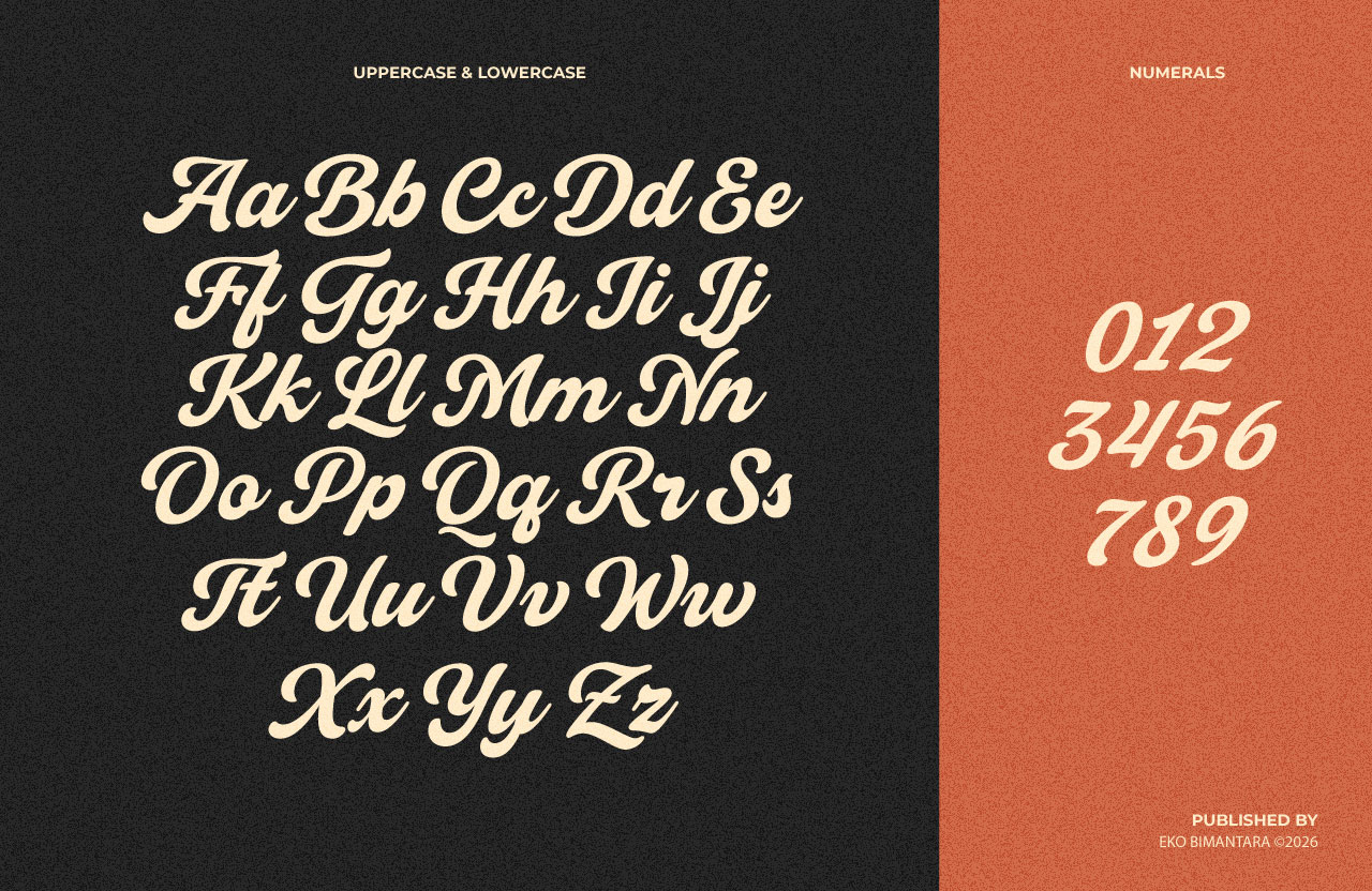Handies is a bold display script typeface that captures a lively, retro-inspired personality with a modern handcrafted touch. Its smooth, flowing letterforms are complemented by confident strokes and playful curves, creating a strong visual presence while maintaining a friendly and approachable tone. The subtle texture and organic rhythm evoke a sense of authenticity, making it ideal for branding, signage, packaging, and lifestyle-oriented designs. Handies shines in large-scale applications, where its expressive character and dynamic movement bring warmth, energy, and a distinctive handcrafted charm to any composition.