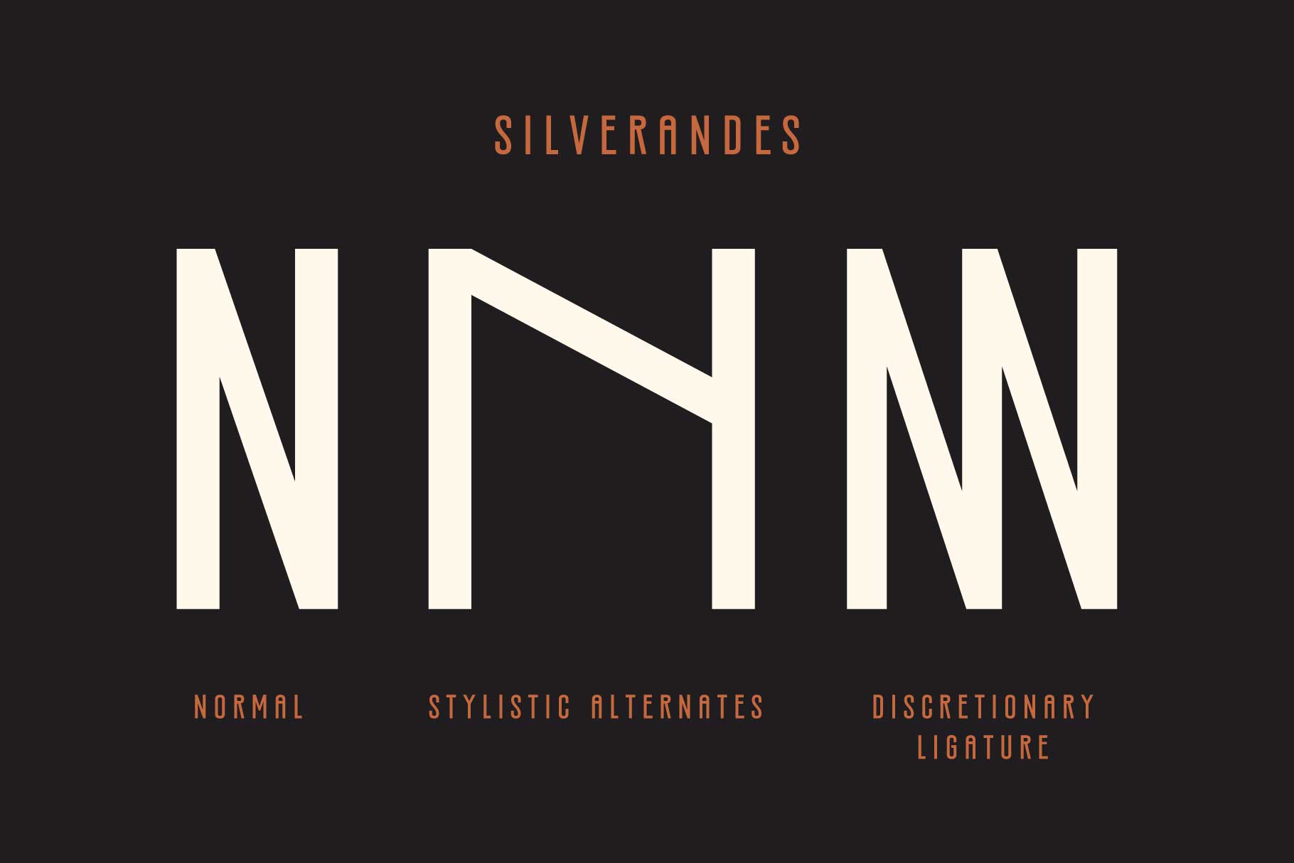 Silverandes is a condensed sans serif font that blends modern elegance with bold, distinctive character. Designed with a refined yet compact structure, it features unique letterforms and an abundance of stylistic alternates, allowing for creative flexibility and customization across various design contexts. One of its standout features is the use of discretionary ligatures, which form compact and artistic letter compositions—adding a sophisticated edge to headlines, logos, and branding work. Silverandes carries a classy and confident presence, making it highly suitable for projects that require a strong visual identity while maintaining a sense of style and modernity. Its versatility allows it to adapt seamlessly across a wide range of themes, from editorial design to web interfaces, product packaging, and high-impact brand visuals.